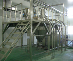 此项目包含小袋拆包投料站,真空输送机和混合配料以及小袋包装线