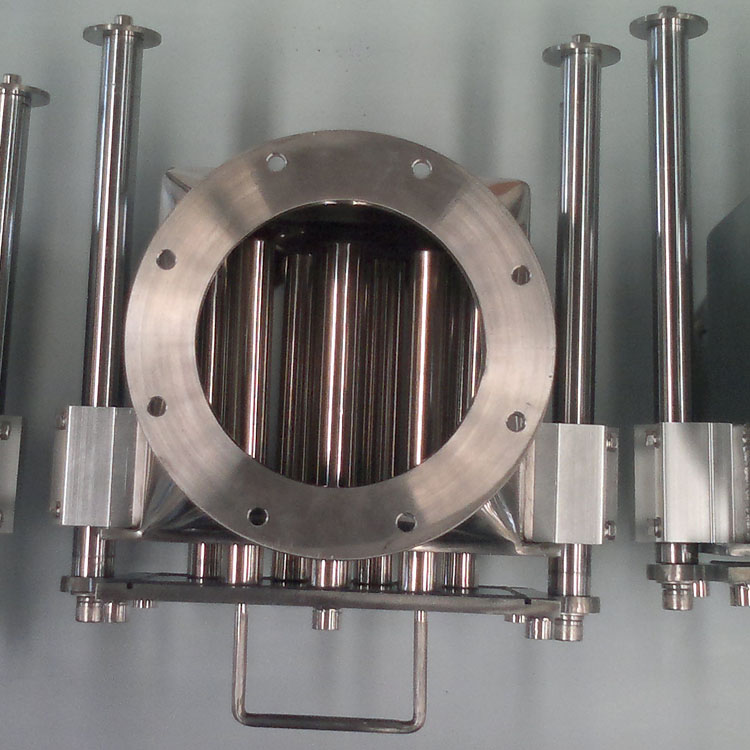机器工作时进料口与物料存储器出口相连,粉状物料均匀落在不锈钢磁棒套管上,粉状物料顺利通过,铁杂质被磁力吸附在磁棒套管表面,使用一段时间后,清理套管表面的铁性杂质。